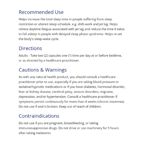 - 멜라토닌 복용 후 5시간 동안 운전 또는 기계 조작을 피하십시오.